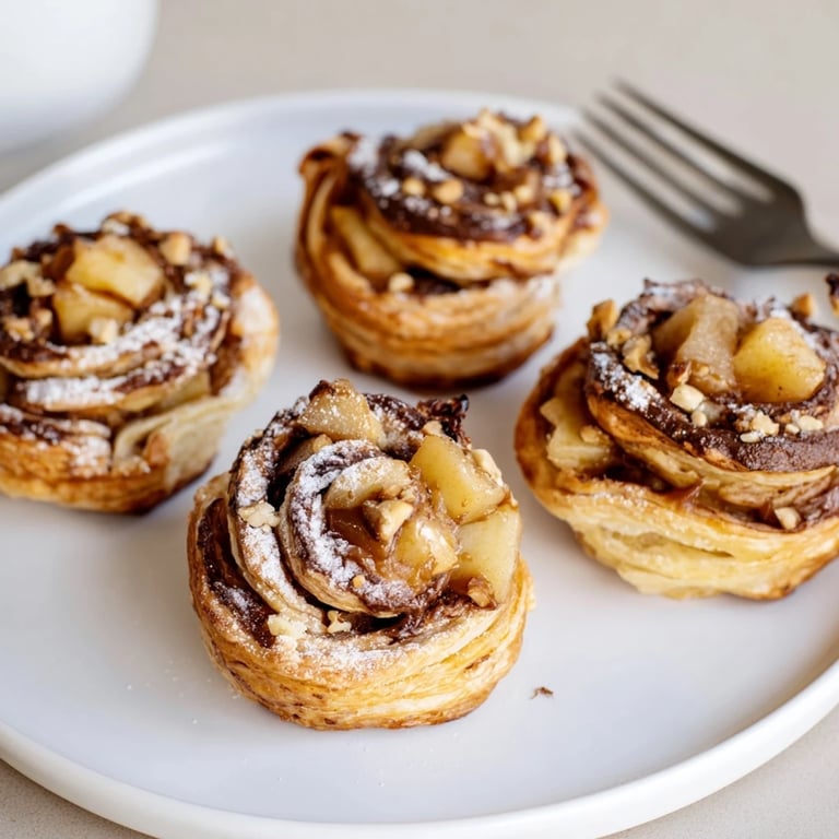 Save Flaky puff pastry spirals filled with creamy Nutella, sautéed caramel apples, and a touch of cinnamon, perfect for a sweet breakfast or festive dessert.