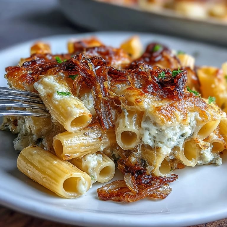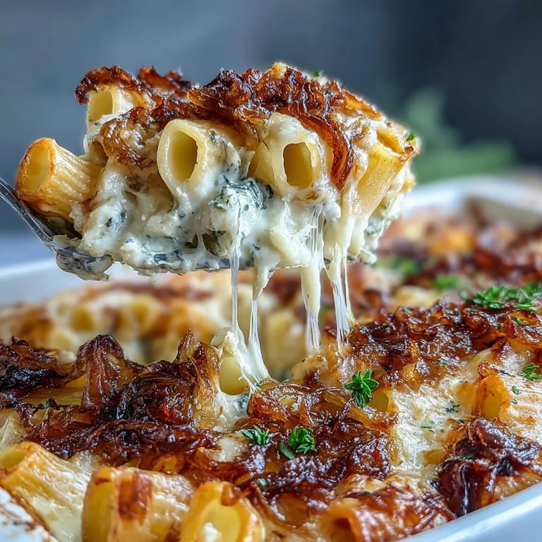 One rainy Saturday, I made this French onion pasta bake for friends who turned up unexpectedly, raindrops still clinging to their coats. Someone brought a bottle of Riesling, and as we laughed about our soggy shoes, the sound of the dish bubbling in the oven became the evening’s background music. A crash of thunder had us huddled at one end of the table, passing around forks to scoop up cheesy noodles straight from the pan. It was chaos and comfort in perfect balance. I can still picture the steam rising every time we pried back another layer of cheese.