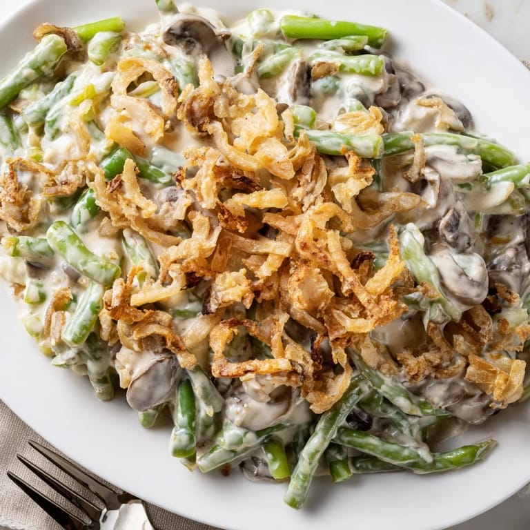 For a cheesier variation, add 50 g of grated sharp cheddar or Gruyère cheese to the sauce before mixing in the green beans. If you prefer a lighter version, substitute half the cream and whole milk with vegetable broth. To make this dish vegan, use plant-based milk, vegan butter, and ensure the fried onions are dairy-free.