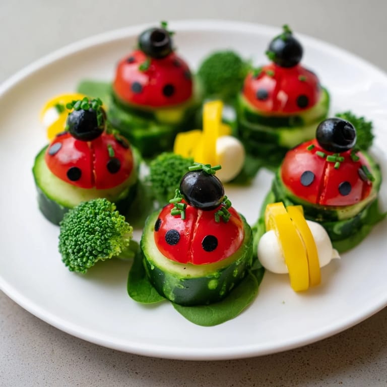 Save A whimsical and colorful appetizer platter featuring fresh vegetables and cheese creatively arranged to resemble ladybugs in a garden—perfect for parties, picnics, or kids gatherings.