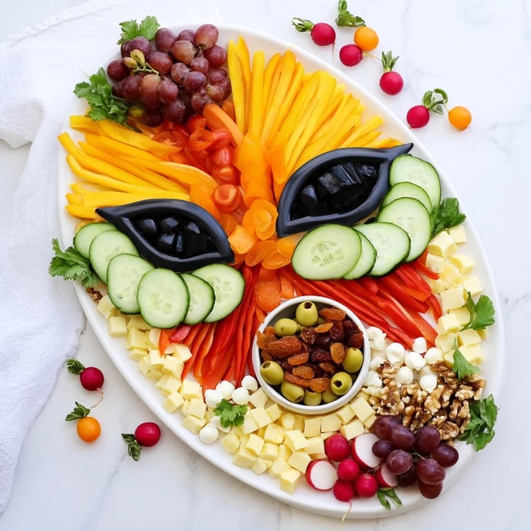 Two large olives or small cheese cubes are used to form the elegant eye shapes near the center of the platter.