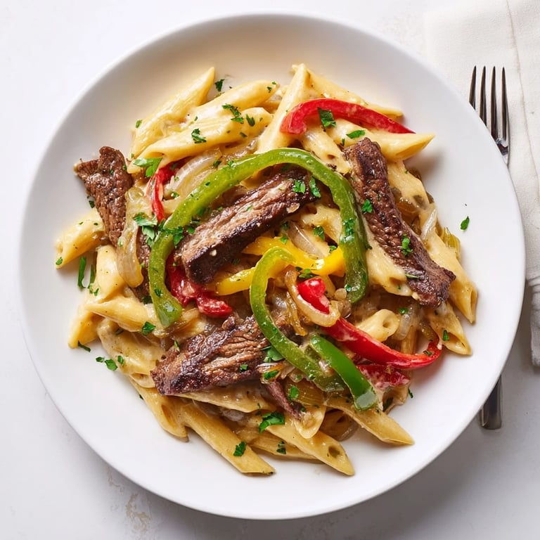 Save A hearty pasta dish inspired by the classic Philly cheesesteak, featuring tender beef, sautéed peppers and onions, and a creamy cheese sauce tossed with pasta.