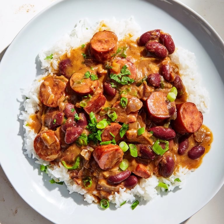 Save A classic Creole dish featuring tender red beans simmered with smoky sausage and aromatic vegetables, served over fluffy white rice. Hearty, flavorful, and perfect for a comforting meal.