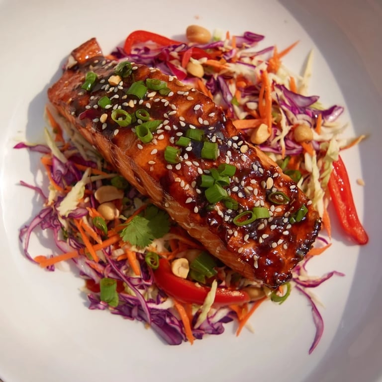 Save A vibrant, healthy bowl featuring glazed teriyaki salmon atop a crisp, colorful Asian slaw, perfect for a fresh and satisfying meal.