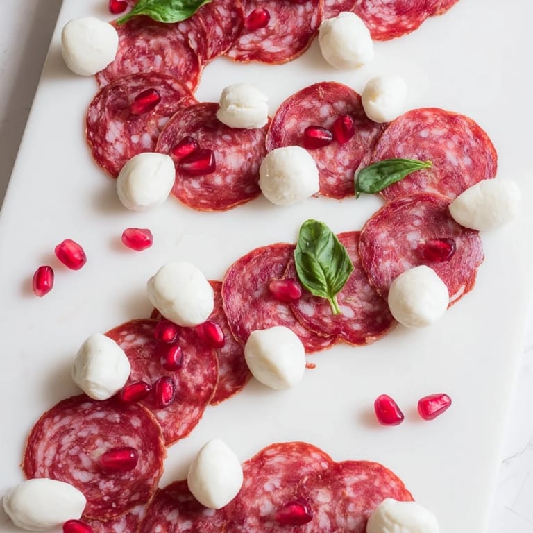 - Start at one corner of your board with overlapping slices of salami, then alternate with mozzarella slices, letting them slightly overlap like roof shingles. The slight transparency of thin salami and the glossiness of fresh mozzarella will create a visual rhythm that looks intentional and beautiful. Curve them gently following your imagined candy cane shape.