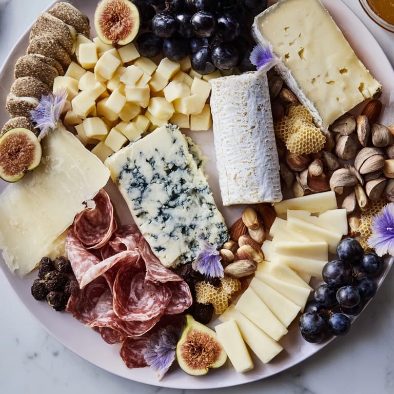 Offering more than just taste, this board doubles as an elegant centerpiece. The contrast of deep blues and purples from the grapes and blueberries with the creamy hues of cheeses creates a visual universe on your platter. Strategic placement of honeycomb and edible flowers brings a touch of natural sparkle, evoking a serene celestial night.