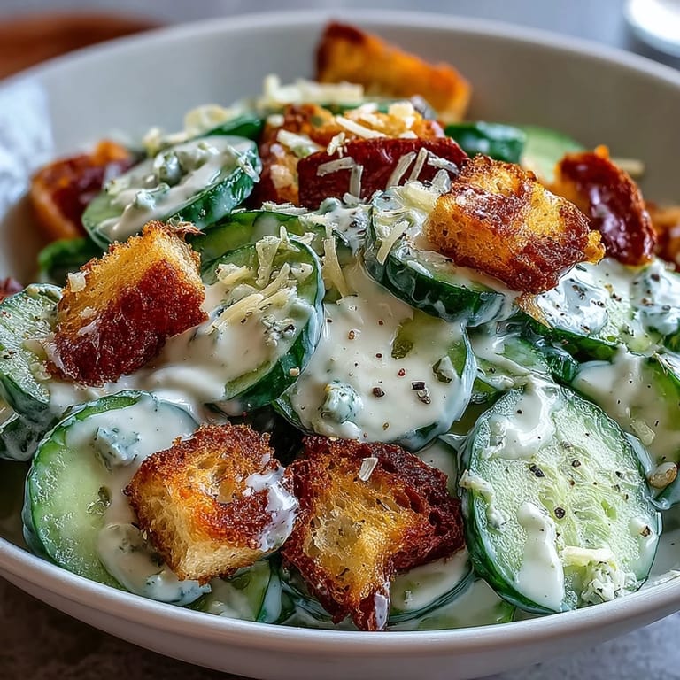 Save This Cucumber Caesar Salad might become your new go-to for a quick weeknight side or an impressive addition to your entertaining menu. The familiar flavors of Caesar dressing paired with the cool crispness of cucumber create a harmonious balance that appeals to salad lovers and skeptics alike. Plus, with its vibrant appearance and versatility, it's as beautiful as it is delicious - proving that sometimes the simplest innovations create the most memorable dishes.