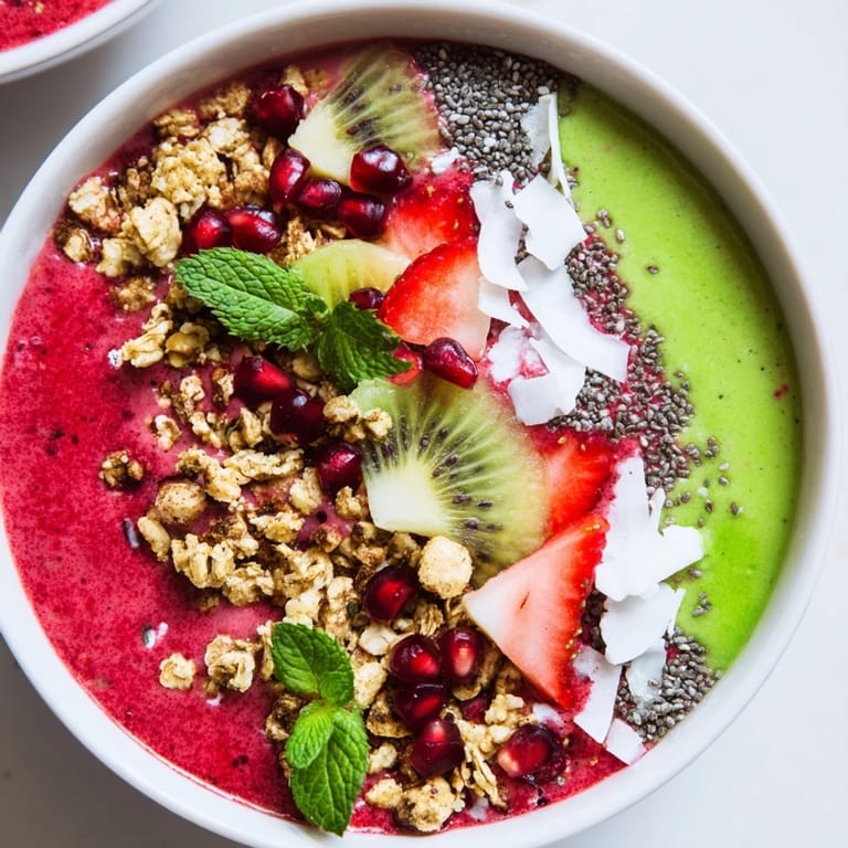 - Toppings: 1/2 cup granola (gluten-free if needed), 1/4 cup fresh pomegranate seeds, 1/2 kiwi sliced, 1/4 cup sliced strawberries, 2 tablespoons shredded coconut, fresh mint leaves (optional)