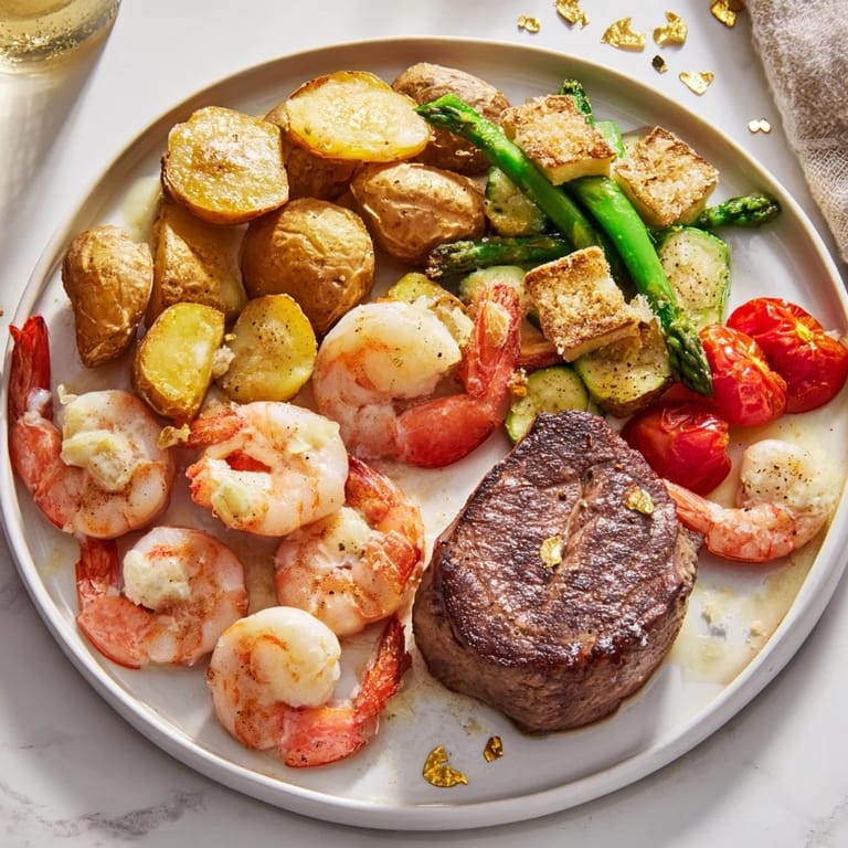 - Arrange potatoes, roasted vegetables, filets, scallops, shrimp, and smoked salmon elegantly on a large platter. Drizzle with the sauce, top with microgreens, and if desired, apply flakes of edible gold leaf for a luxurious finish.