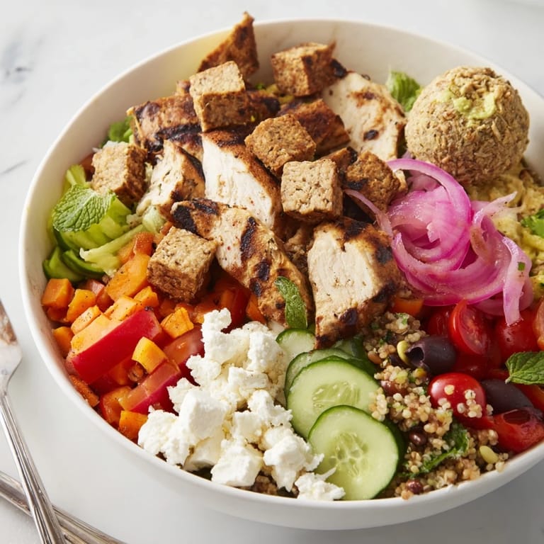 - Prepare all protein options according to preference. Grill, bake, or sauté chicken, tofu, shrimp, and falafel. Keep warm or at room temperature.