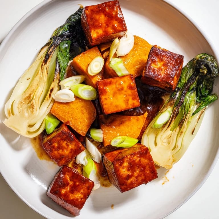Save A vibrant, umami-packed plant-based main featuring caramelized tofu and roasted winter squash, topped with a savory miso glaze and served alongside tender bok choy.